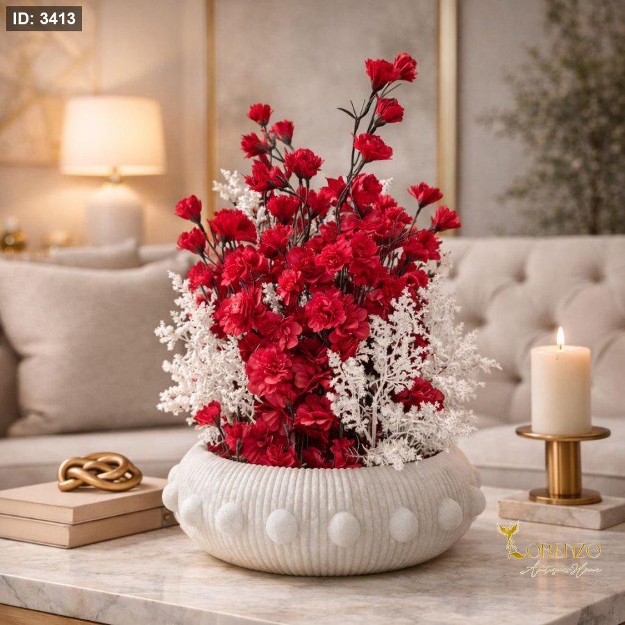 تنسيق جريء من الزهور الحمراء الغنية مع لمسات بيضاء داخل وعاء سيراميك أبيض مزخرف بتصميم مميز. يخلق تباينًا جميلًا بين الأحمر القوي والأبيض الهادئ، مما يجعله قطعة ديكور بارزة تضيف طابعًا دافئًا وأنيقًا لأي مساحة.