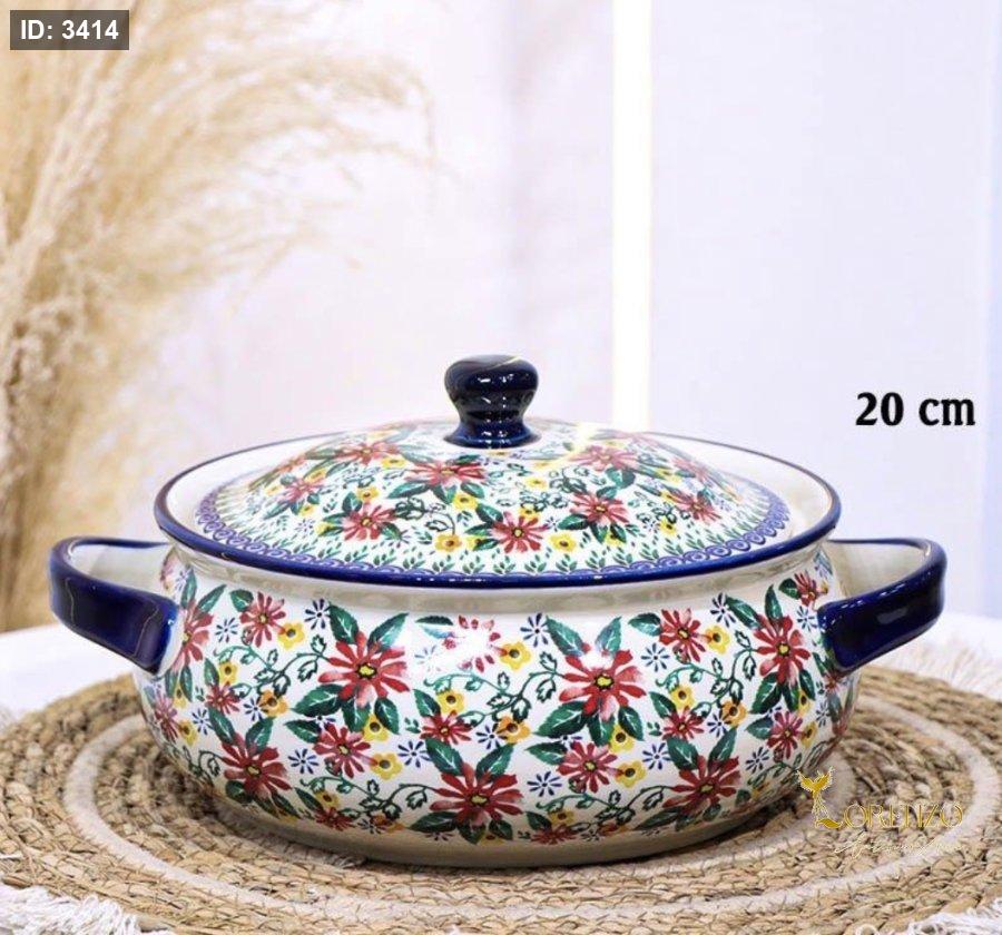طنجرة بورسلان خزف 20سم اطار كحلي وجه ورد بيج وزهري واخضر