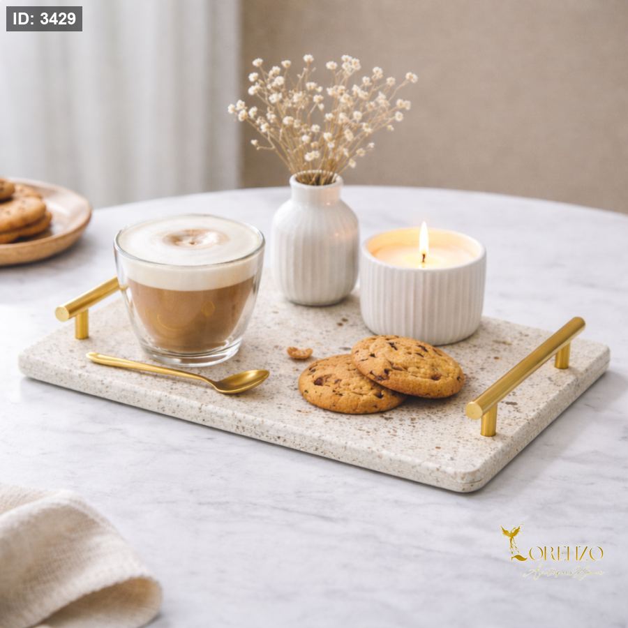 صينية تقديم بتصميم عصري وأنيق، مصنوعة من حجر التيرازو بلون أوف وايت مع مسكات معدنية ذهبية فخمة. تصميمها الناعم والراقي بيضيف لمسة مميزة لأي زاوية بالبيت، سواء على طاولة القهوة، طاولة الضيافة أو الكومودينا. مثالية لتقديم القهوة والحلويات، أو لترتيب الشموع والعطور والإكسسوارات بطريقة مرتبة وجذابة. قطعة ديكور عملية تجمع بين الجمال والاستخدام اليومي.