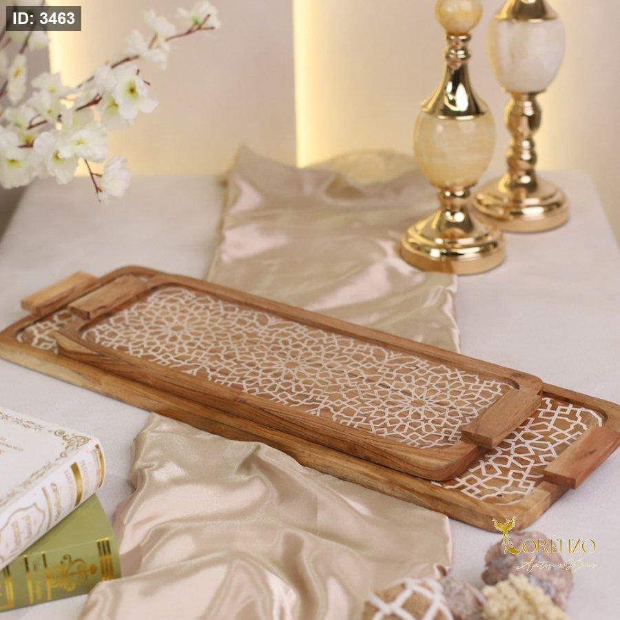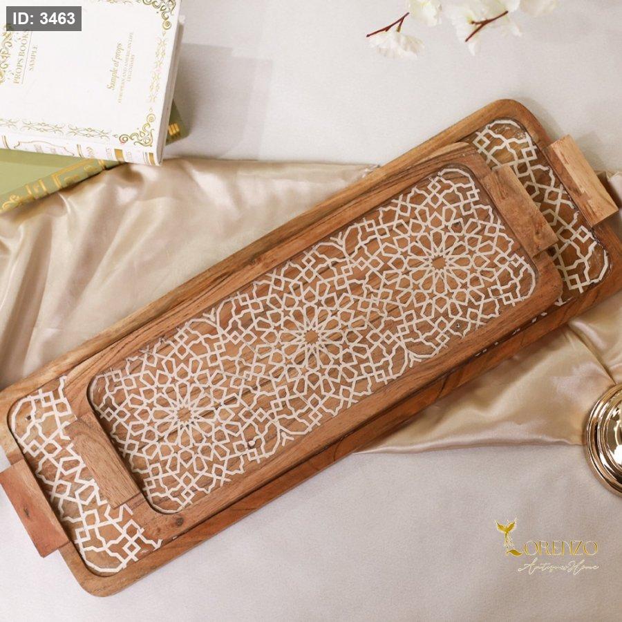 طقم صواني ضيافة مستطيل خشب منقش ابيض D252