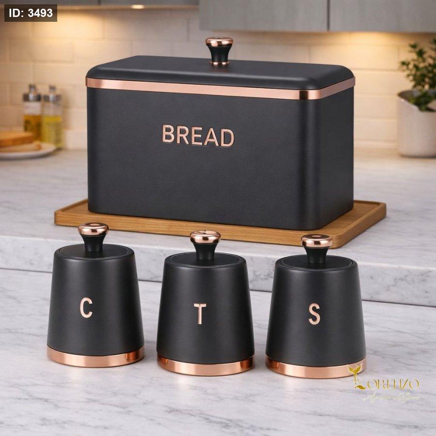 مجموعة أنيقة وعصرية لتنظيم المطبخ تضيف لمسة فخامة وهدوء إلى ديكور منزلك. تتكون المجموعة من علبة خبز كبيرة وثلاث علب للتخزين بتصميم متناسق ولون اسود مع تفاصيل ذهبية وردية تضفي مظهراً راقياً يناسب المطابخ الحديثة.