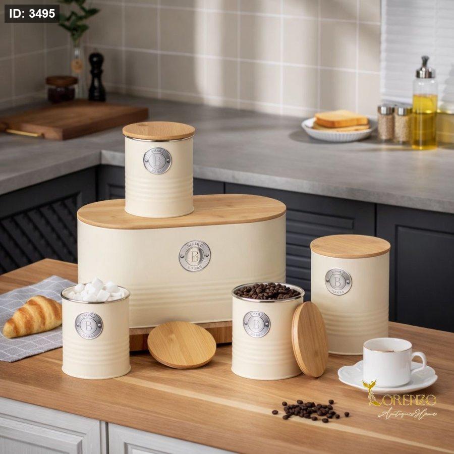 طقم منظمات مطبخ أنيق يجمع بين التصميم العصري واللمسة الطبيعية، ليمنح مطبخك مظهراً مرتباً وجذاباً. يتكون الطقم من علبة خبز كبيرة وأربع علب تخزين متعددة الاستخدامات، مصممة بلون كريمي هادئ مع أغطية خشبية طبيعية تضيف دفئاً وأناقة إلى ديكور المطبخ.