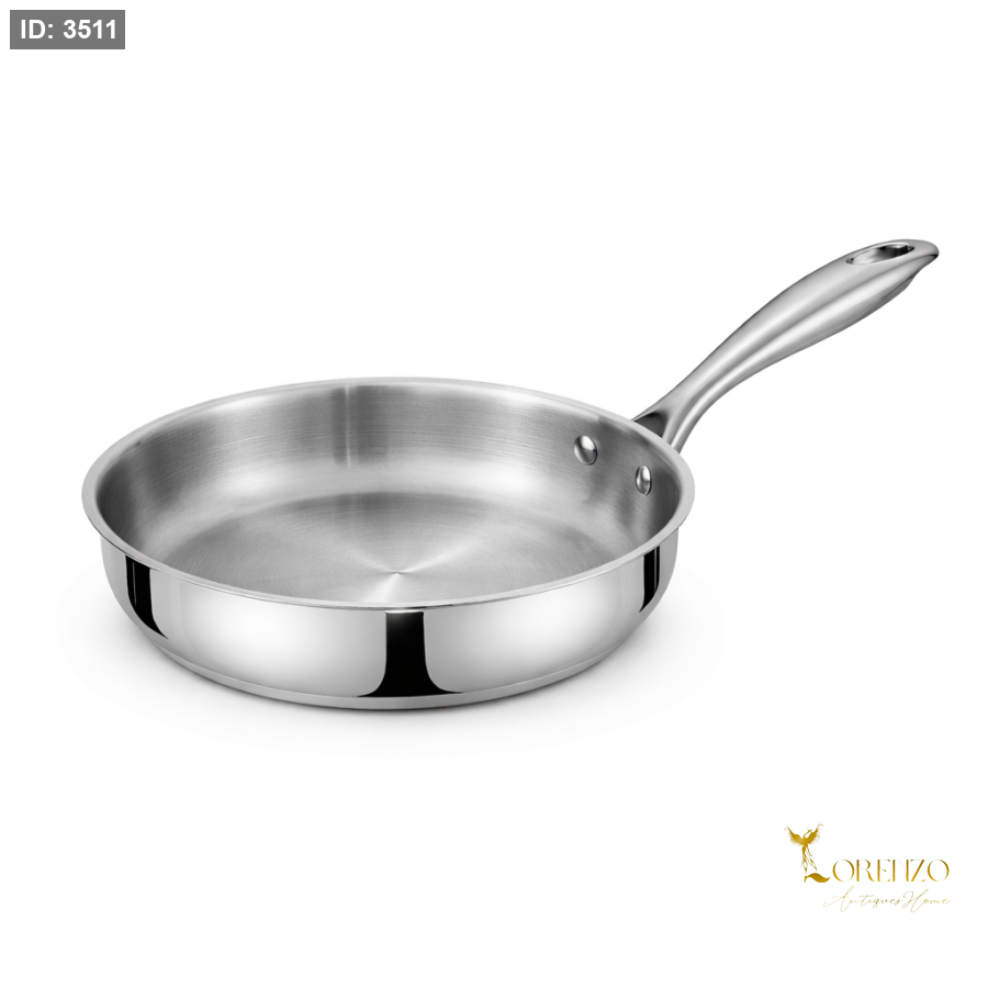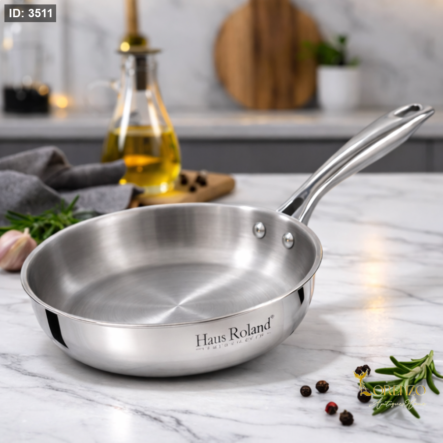 مقلاة عملية عالية الجودة من Haus Roland بتصميم ألماني أنيق، مصنوعة من الستانلس ستيل المتين مع قاعدة متعددة الطبقات لتوزيع الحرارة بشكل متساوٍ أثناء الطهي. مناسبة للاستخدام اليومي في تحضير البيض، اللحوم، الخضار والعديد من الوصفات.