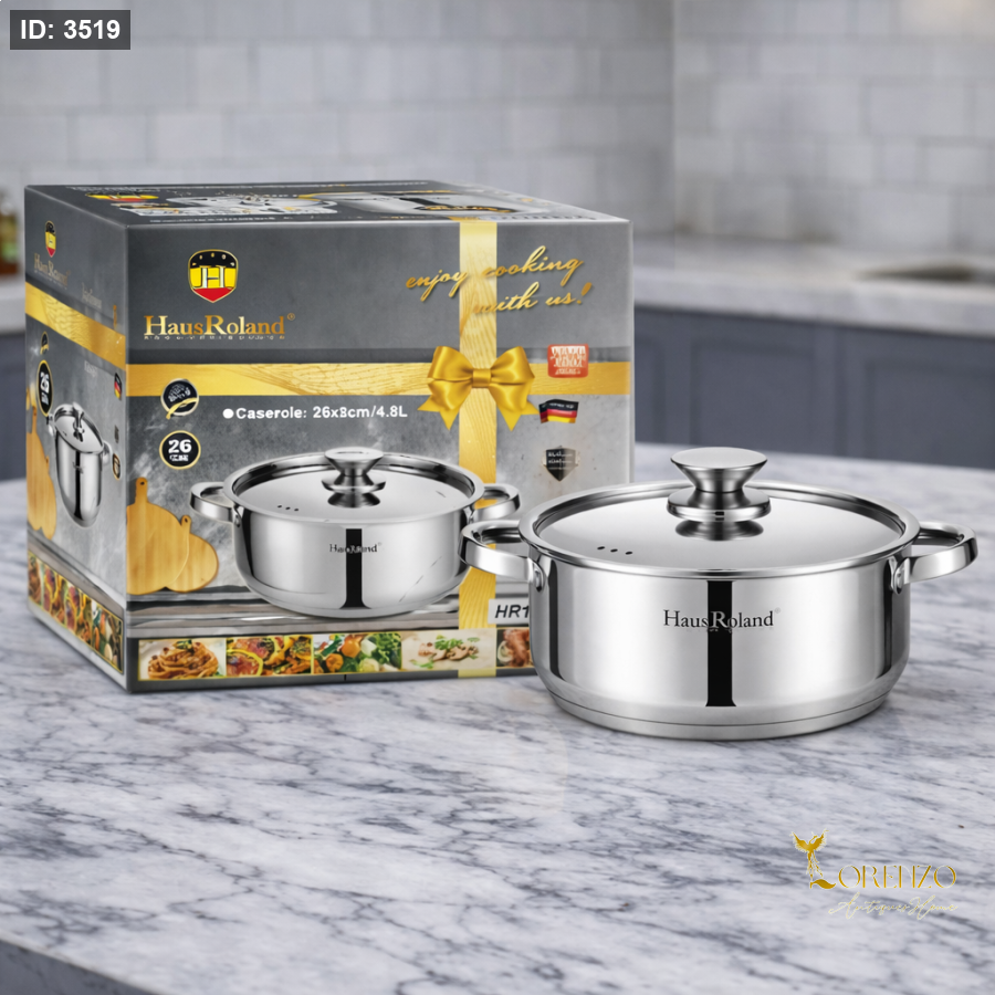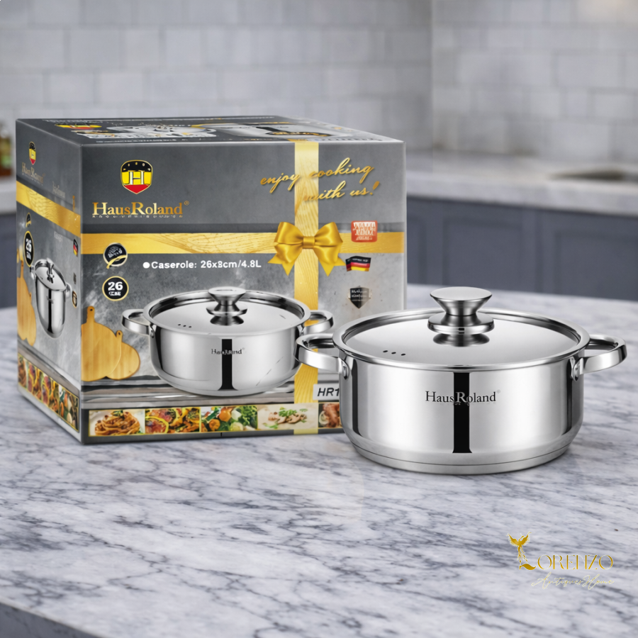 طنجرة طبخ أنيقة وعملية من علامة Haus Roland الألمانية، مصنوعة من الستانلس ستيل عالي الجودة بتصميم عصري ولمعة مرآة تعطي مظهراً راقياً في المطبخ. تتميز بقاعدة حرارية متعددة الطبقات تساعد على توزيع الحرارة بشكل متساوٍ لضمان طهي الطعام بكفاءة.
