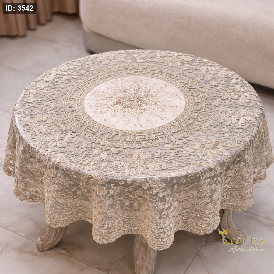 حوّل طاولتك إلى قطعة فنية راقية مع هذا المفرش الدائري الفاخر، المصمم بعناية فائقة ليجمع بين الفخامة الكلاسيكية والتفاصيل العصرية. يتميز بتطريز دقيق بخيوط ذهبية/فضية على قماش شفاف فاخر، مع تصميم دائري مركزي أنيق يلفت الأنظار ويمنح طاولتك حضورًا مميزًا.