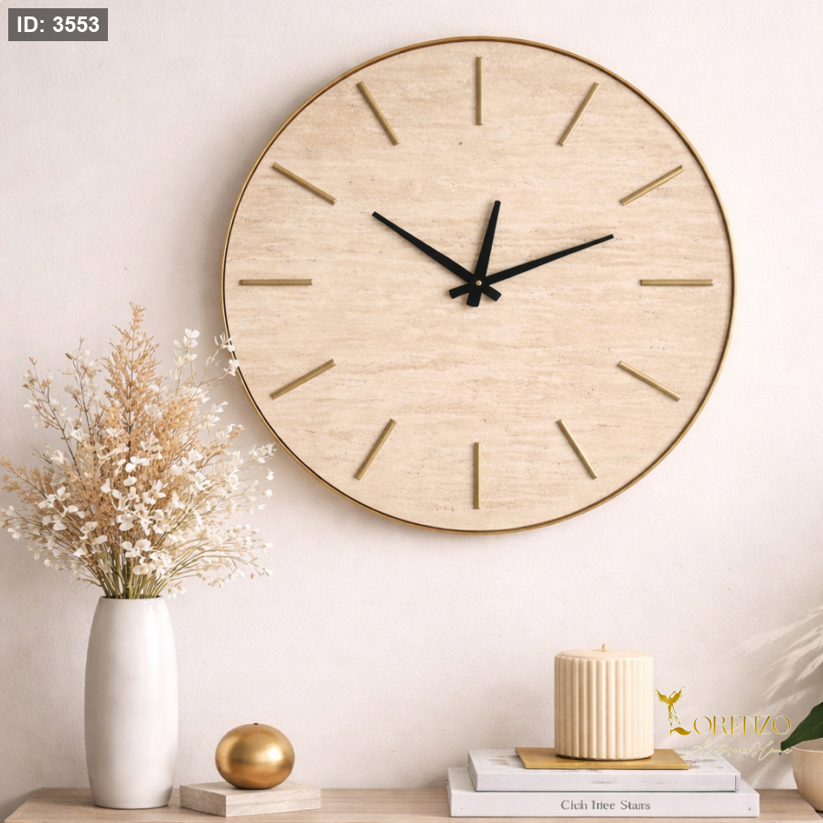 ساعة حائط أنيقة بتصميم عصري تضيف لمسة فخامة لأي مساحة في المنزل. تتميز بواجهة بلون حجري طبيعي مع إطار معدني رفيع باللون الذهبي ومؤشرات أنيقة تعطي مظهراً راقياً وبسيطاً في نفس الوقت. تصميمها الهادئ يناسب الصالون، غرفة المعيشة، المكتب أو المدخل ويكمل الديكور الحديث بسهولة.
