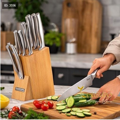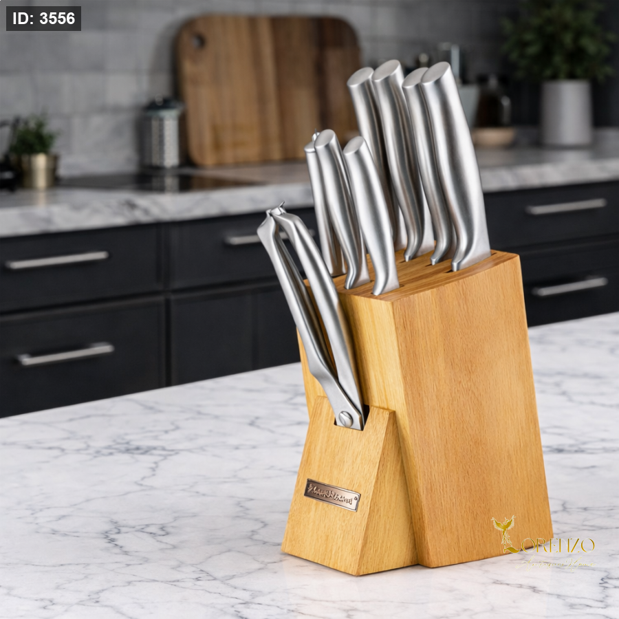 يأتي الطقم مع ستاند خشبي متين لترتيب السكاكين بشكل عملي وآمن على سطح المطبخ.