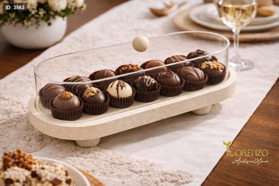 صندوق تقديم شوكولاتة بتصميم عصري يجمع بين قاعدة فاتحة اللون وغطاء زجاجي شفاف.