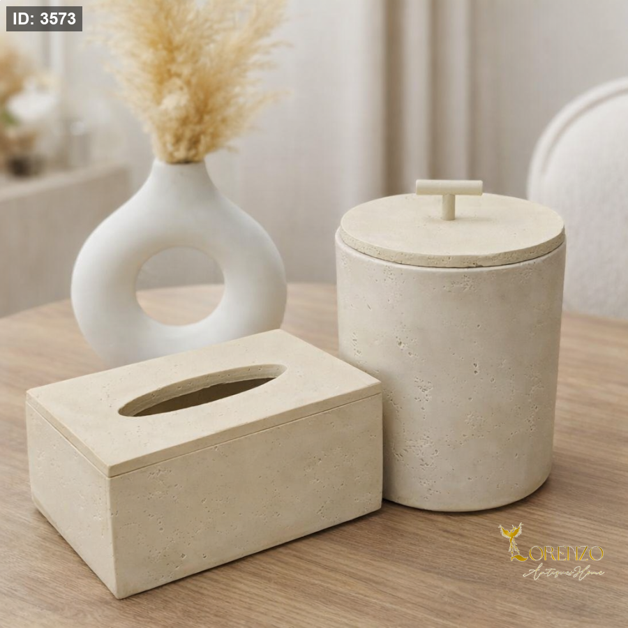 طقم أنيق بتصميم عصري ولون بيج هادئ يضيف لمسة فخامة وترتيب لأي مساحة في المنزل. يتكوّن من علبة مناديل مستطيلة وعلبة تخزين بغطاء، مثالي لتنسيق الطاولات والحمامات أو طاولات الضيافة بطريقة مرتبة وأنيقة.