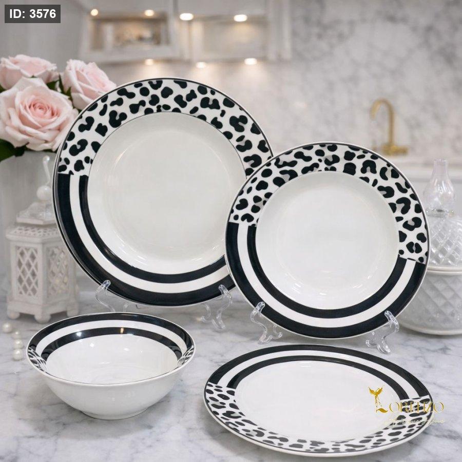 أضف لمسة من الأناقة والفخامة إلى مائدتك مع طقم الصحون المميز من Lorenzo Antiques Home. يتميز هذا الطقم بتصميم عصري يجمع بين اللون الأبيض والاسود النقي مع النقشة الجريئة ليمنح مائدة الطعام حضوراً راقياً ومميزاً.