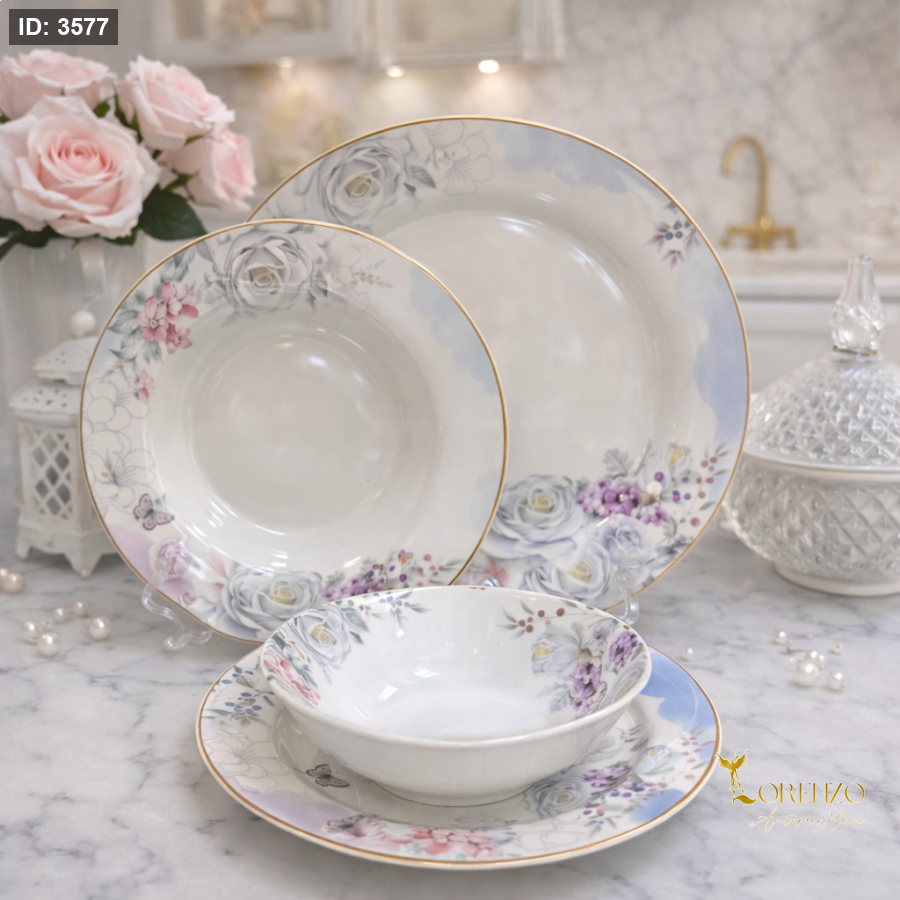 طقم صحون بورسلان فاخر 24 قطعة – نقشة ورود ناعمة بحافة ذهبية