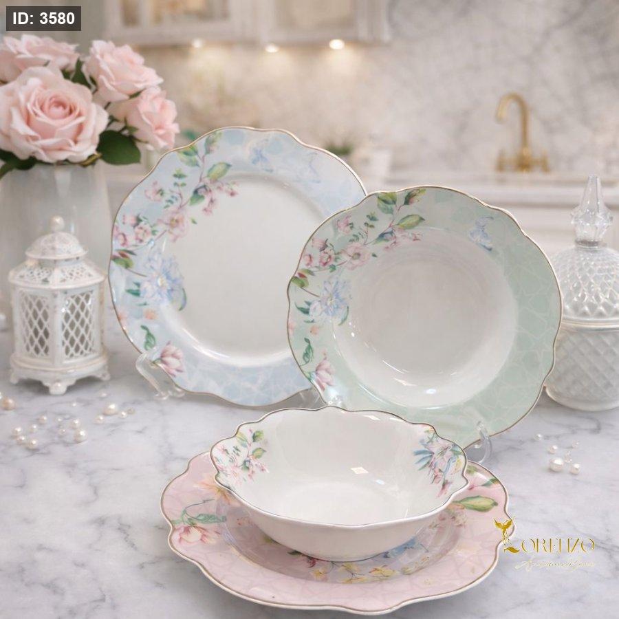 طقم سفرة بورسلان بتصميم عصري ناعم وألوان هادئة مزينة برسومات زهور رقيقة تعطي المائدة لمسة راقية ومميزة. يتميز بخفة شكله وأناقة حوافه المتموجة، ليكون مناسباً للاستخدام اليومي ولتقديم الطعام بطريقة جميلة.