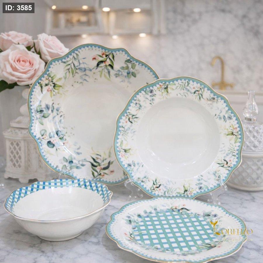 طقم سفرة أنيق بتصميم ناعم مستوحى من الطبيعة، يتميز بزخارف أوراق وزهور رقيقة مع إطار باللون الأزرق الفاتح يمنح الطاولة لمسة راقية وهادئة. مثالي للاستخدام اليومي ولتقديم الطعام للضيوف بطريقة جميلة.