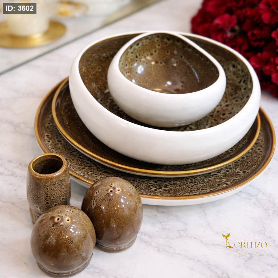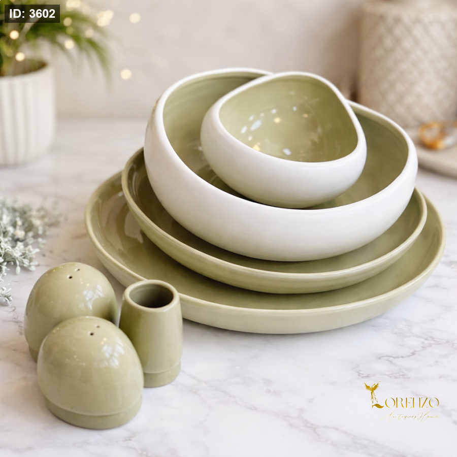 طقم مميز بتصميم فريد مستوحى من شكل الفطر العصري (حواف سميكة ناعمة)، يجمع بين البساطة والفخامة ليعطي مائدتك طابع أنيق ومختلف.