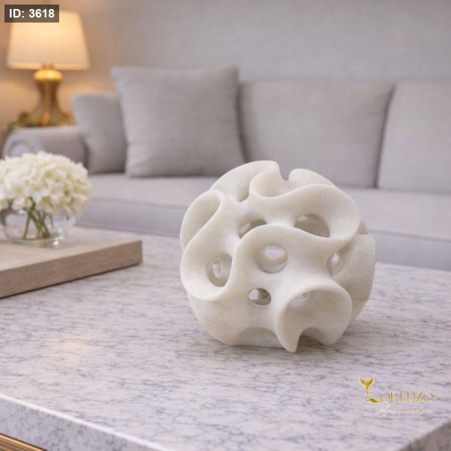 يأتي بتصميم ثلاثي الأبعاد مع فتحات دائرية متداخلة تعكس أسلوب الفن الحديث، مما يجعله قطعة لافتة للنظر على أي طاولة أو رف. لونه الهادئ وملمسه الناعم يجعلان منه خياراً مثالياً لمحبي الديكور المينيمال والراقي.