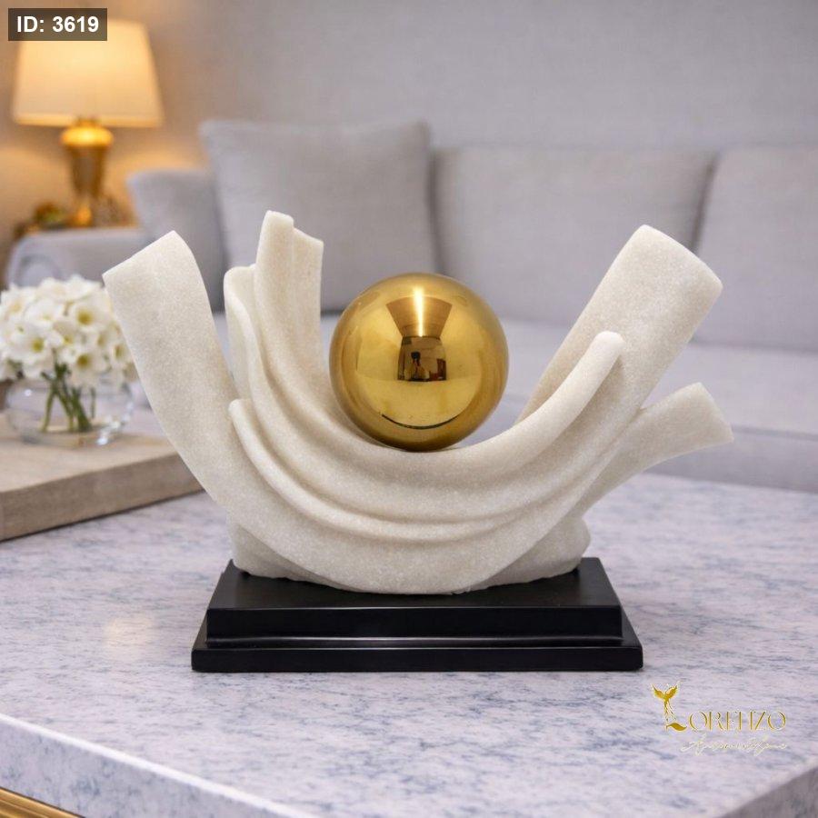 قطعة فنية فاخرة تجمع بين الحداثة والأناقة، مصممة لتكون نقطة جذب مميزة في أي مساحة. يتميز مجسم لورينزو الذهبي بتصميمه الانسيابي الفريد الذي يحتضن كرة ذهبية لامعة، مما يخلق توازن بصري جذاب بين النعومة والفخامة.