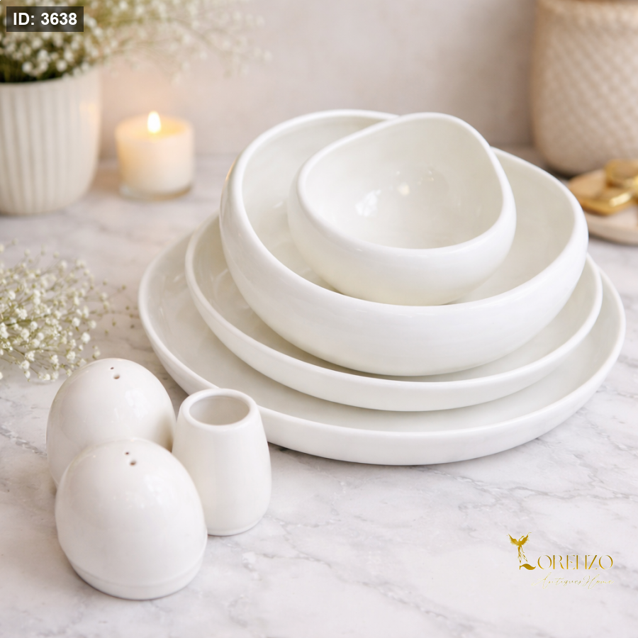 يتميز الطقم بشكل دائري انسيابي مع حواف ناعمة ولمعة خفيفة تعكس جودة السيراميك. اللون الأبيض الموحد يعطي مظهر مرتب وهادئ، ويسهل تنسيقه مع أي ألوان أخرى على الطاولة (مفارش، كاسات، أدوات تقديم).