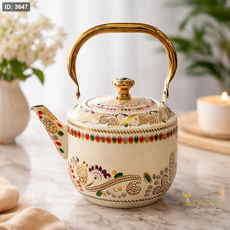 إبريق شاي فاخر بتصميم أنيق يجمع بين الفخامة والطابع التراثي العصري، ليمنح تجربة تقديم استثنائية في كل مرة. يتميز الإبريق بلون عاجي هادئ مزين بنقوش يدوية دقيقة بألوان دافئة (أحمر، أخضر، ذهبي) تضيف لمسة فنية راقية تناسب جميع الأذواق.