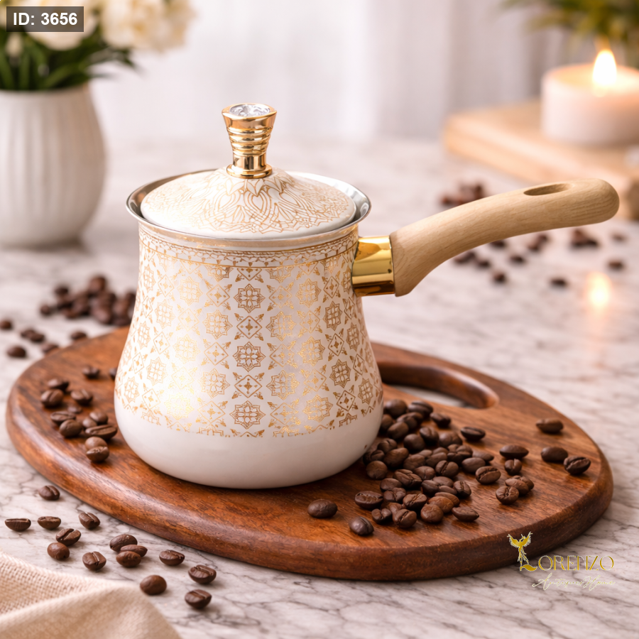 وعاء تحضير القهوة/الحليب بتصميم أنيق يجمع بين البساطة العصرية والفخامة الهادئة، ليكون قطعة عملية وجمالية في نفس الوقت. يتميز بلون عاجي ناعم مزين بنقوش ذهبية دقيقة تضيف لمسة راقية مستوحاة من الزخارف الشرقية، ما يجعله مثاليًا للاستخدام اليومي أو التقديم أمام الضيوف.