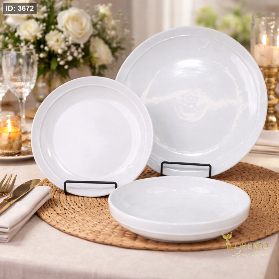 طقم صحون أبيض فاخر بتصميم عصري ناعم، يجمع بين البساطة والأناقة ليضفي لمسة راقية على مائدتك اليومية والمناسبات الخاصة. يتميز بلونه الأبيض النقي الذي يتناسق بسهولة مع مختلف أنواع الديكور وألوان السفرة.