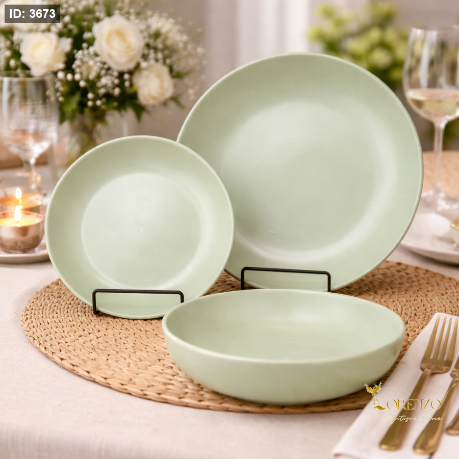 طقم صحون أخضر فاتح بتصميم عصري ناعم، يمنح مائدتك لمسة هدوء وأناقة طبيعية مستوحاة من ألوان الطبيعة. يتميز بلونه الهادئ والمنعش الذي يضيف إحساسًا بالراحة والفخامة في آنٍ واحد، ليكون خيارًا مثاليًا لكل من يحب البساطة الراقية.