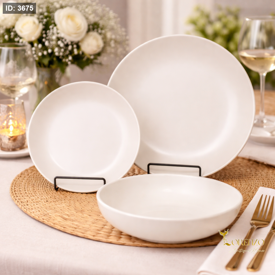 طقم صحون فاخر بلون أوف وايت (عاجي) أنيق مكوّن من 18 قطعة، يتميز بتصميمه العصري الناعم الذي يضفي لمسة فخامة وهدوء على مائدتك. لونه الدافئ والراقي يجعله خيارًا مثاليًا للتنسيق مع جميع ألوان السفرة والديكورات.