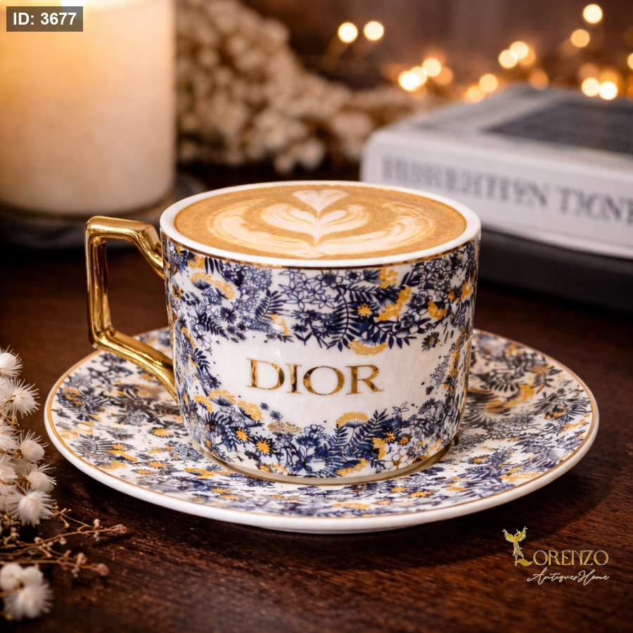 فنجان قهوة فاخر مع صحن بتصميم أنيق مستوحى من الطابع الكلاسيكي الراقي، يجمع بين اللونين الأزرق الداكن والذهبي ليمنحك تجربة تقديم مميزة وفخمة. يتميز بزخارف دقيقة تضيف لمسة فنية جذابة، مع كتابة أنيقة تعزز من فخامة التصميم.
