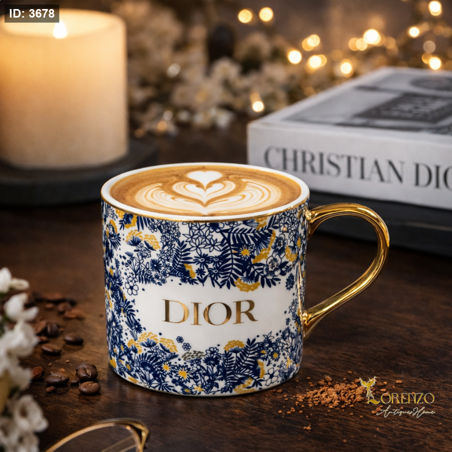 كوب قهوة فاخر بتصميم أنيق مستوحى من الطابع الكلاسيكي الراقي، يجمع بين النقوش الزرقاء الهادئة والتفاصيل الذهبية الفاخرة ليمنحك تجربة شرب استثنائية مليئة بالأناقة.