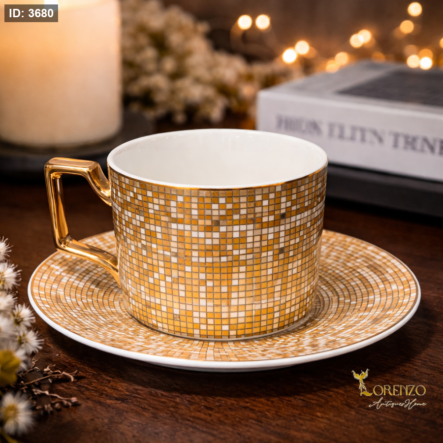 فنجان قهوة مع صحن بتصميم هندسي فاخر مستوحى من الطابع العصري الأنيق، يجمع بين اللونين الذهبي والأبيض بنمط مميز يضفي لمسة فخامة على كل جلسة قهوة.