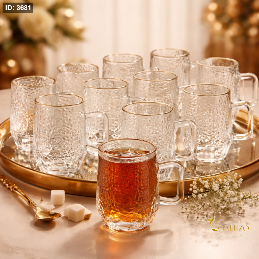 استمتع بتجربة شاي راقية مع طقم كاسات الشاي الزجاجي الفاخر المكوّن من 12 قطعة، بتصميم أنيق يجمع بين البساطة والفخامة. تتميز الكاسات بنقشة بارزة جذابة تعكس الضوء بشكل جميل، مع حافة ذهبية رفيعة تضيف لمسة من الرقي لكل جلسة.