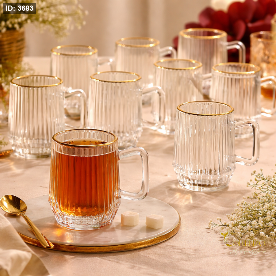 طقم كاسات شاي بتصميم عصري أنيق يجمع بين البساطة والفخامة، مزوّد بنقشة خطوط طولية ناعمة تضيف لمسة مميزة وتعكس الضوء بشكل جذاب. الحافة الذهبية الراقية تعطي الكاسات طابع فاخر يليق بجلسات الضيافة الراقية.