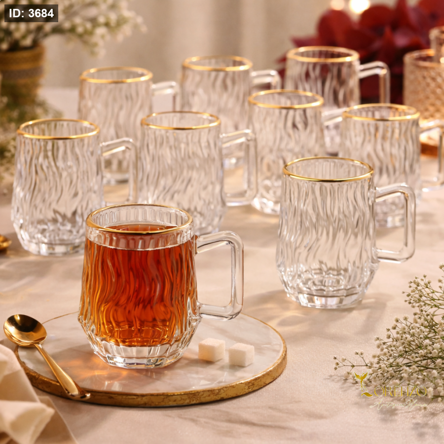 طقم كاسات شاي بتصميم مموج أنيق يضيف لمسة عصرية وفخمة على طاولة الضيافة. النقشة المميزة تعكس الضوء بشكل جميل وتعطي إحساس بالفخامة والبساطة بنفس الوقت، مع حافة ذهبية ناعمة تزيد من أناقة الكاسات.