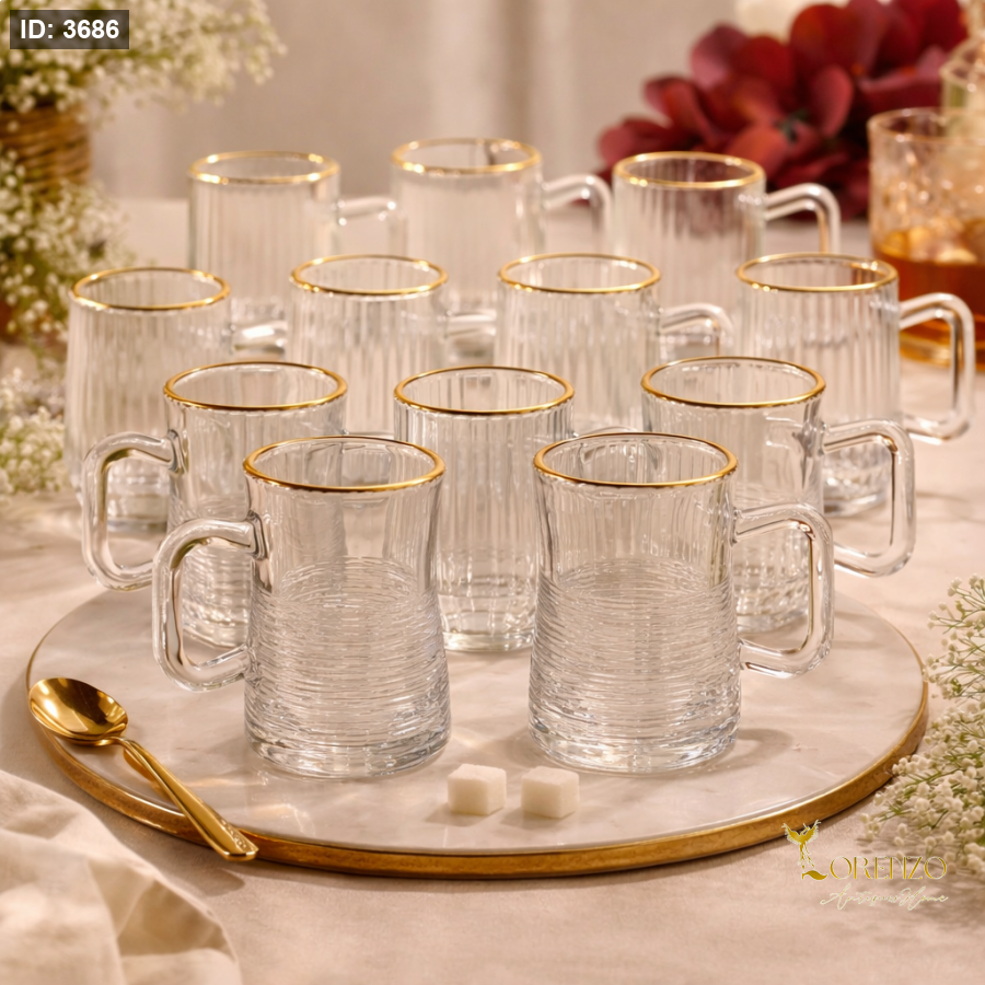 طقم استكانات شاي فاخر يجمع بين الأناقة والبساطة، مكوّن من 12 استكانة زجاجية . تتميز الاستكانات بشكلها الانسيابي ونقشتها الناعمة التي تعكس الضوء بشكل جميل، مع حافة ذهبية تضيف لمسة فخامة مميزة لكل جلسة.
