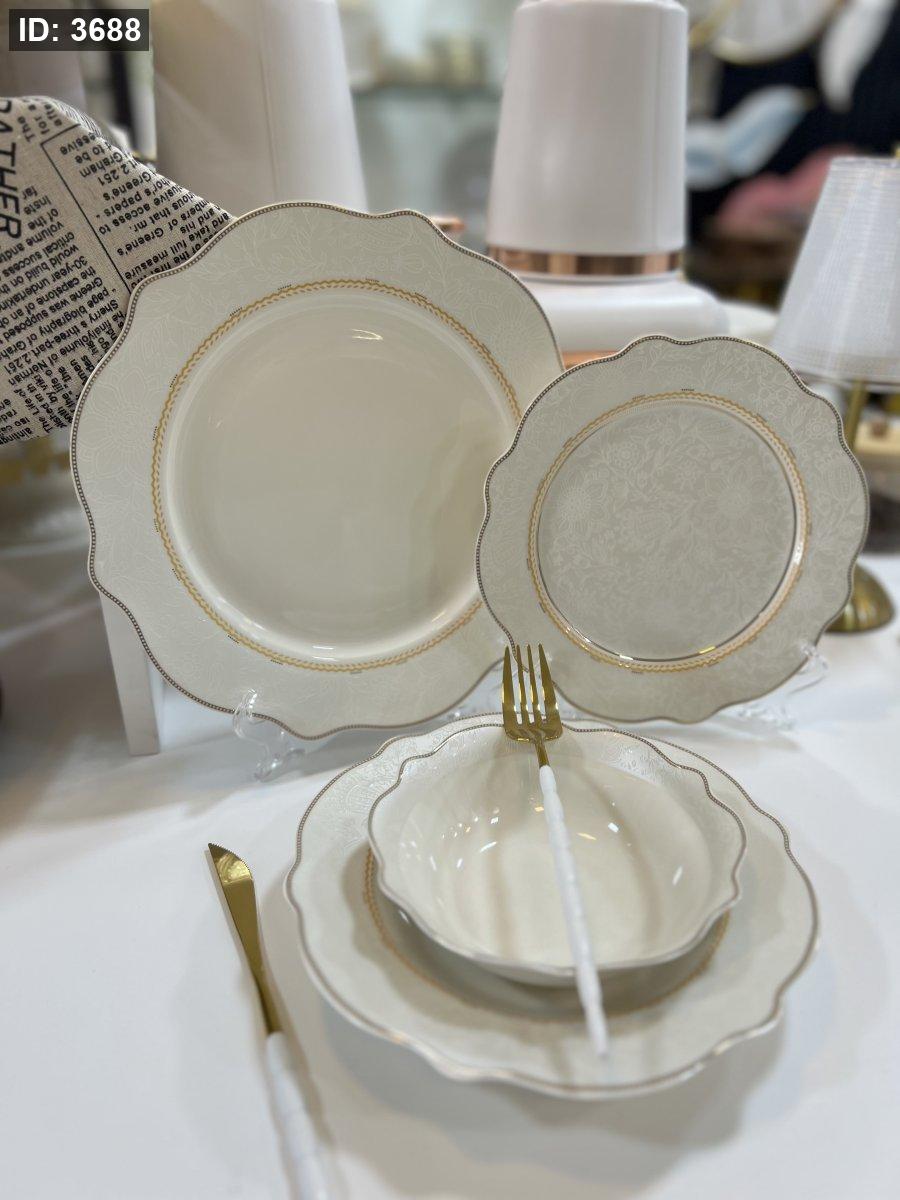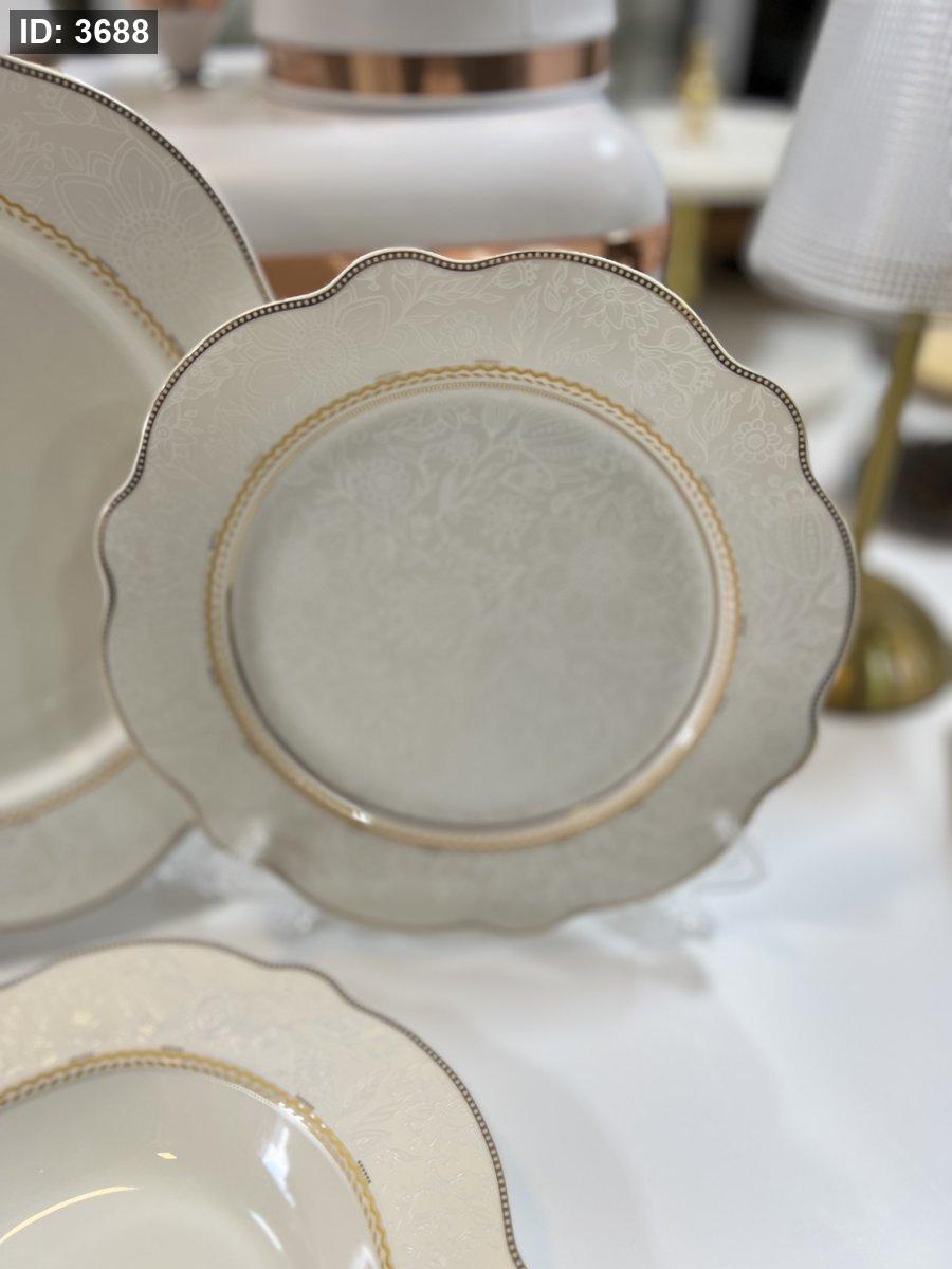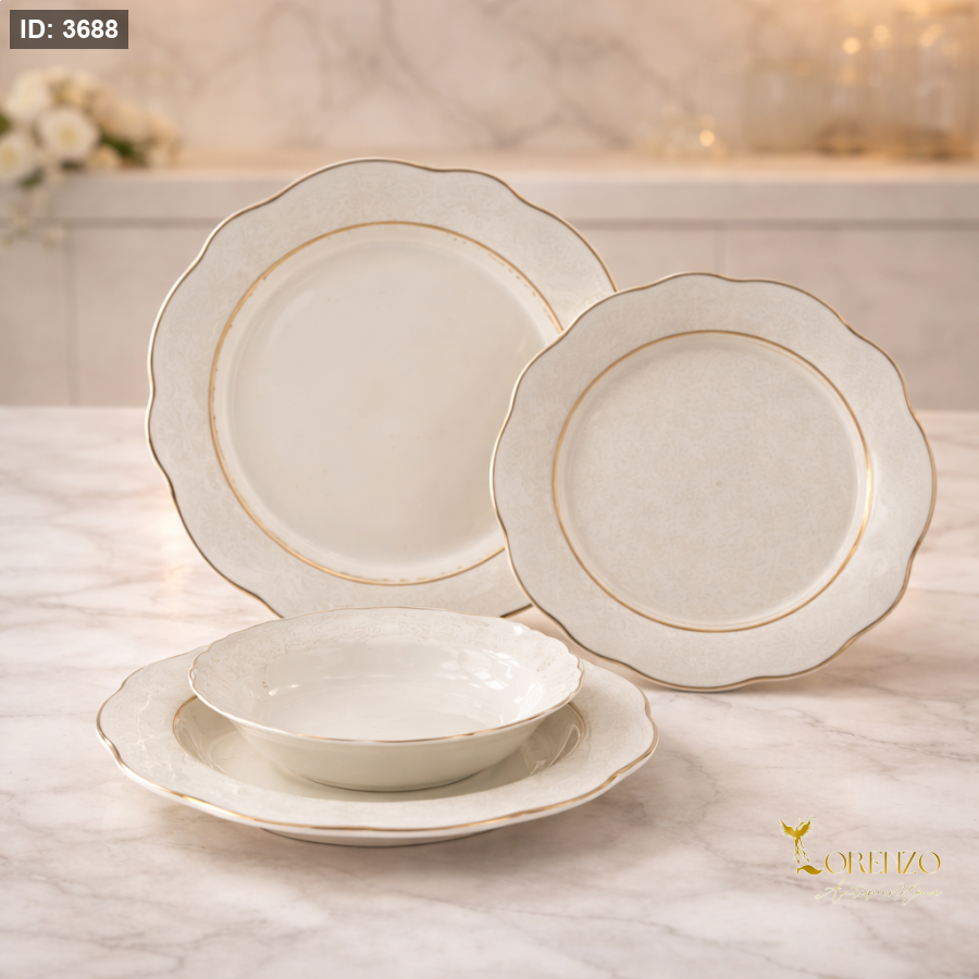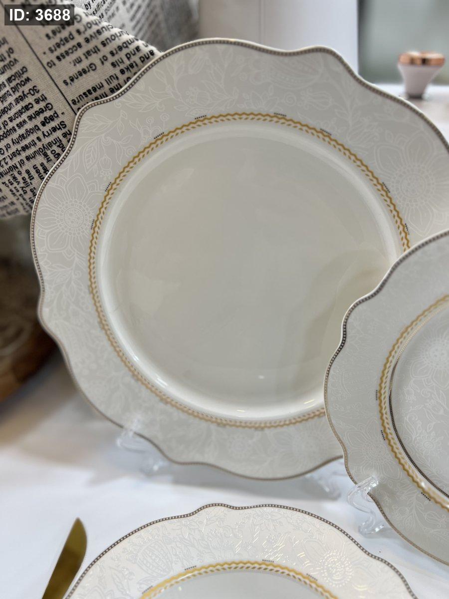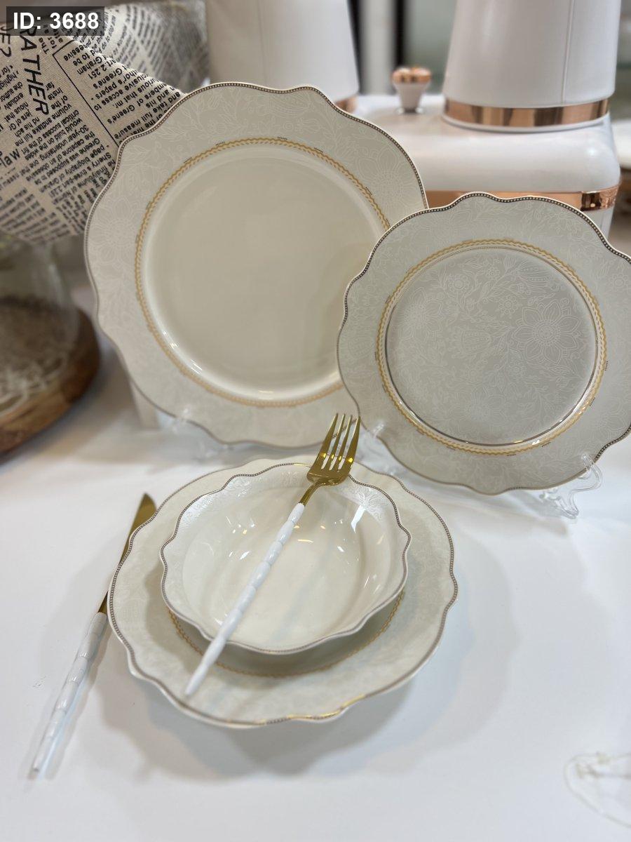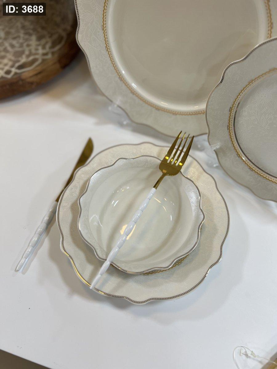 طقم صحون بورسلان فاخر – 24 قطعة | تصميم أنيق بلمسة ذهبية ناعمة
