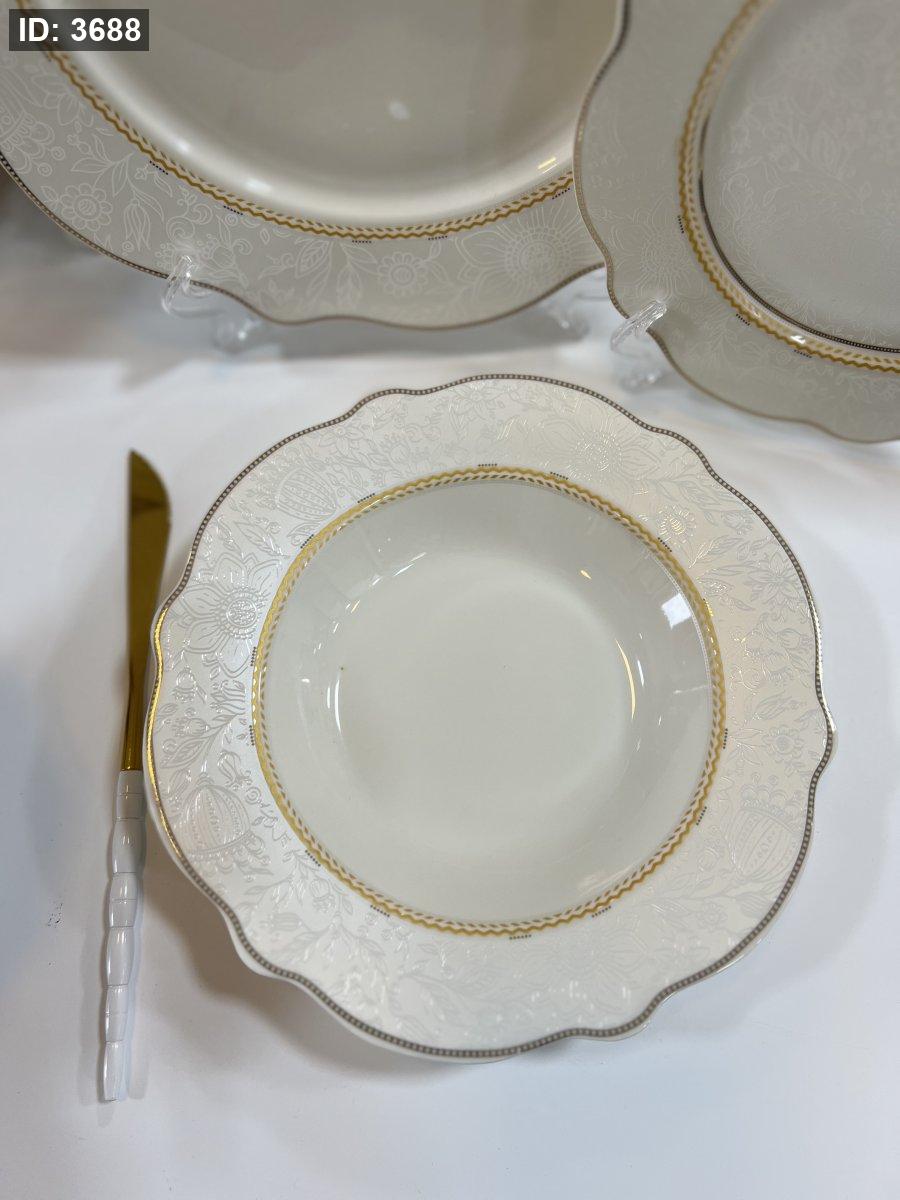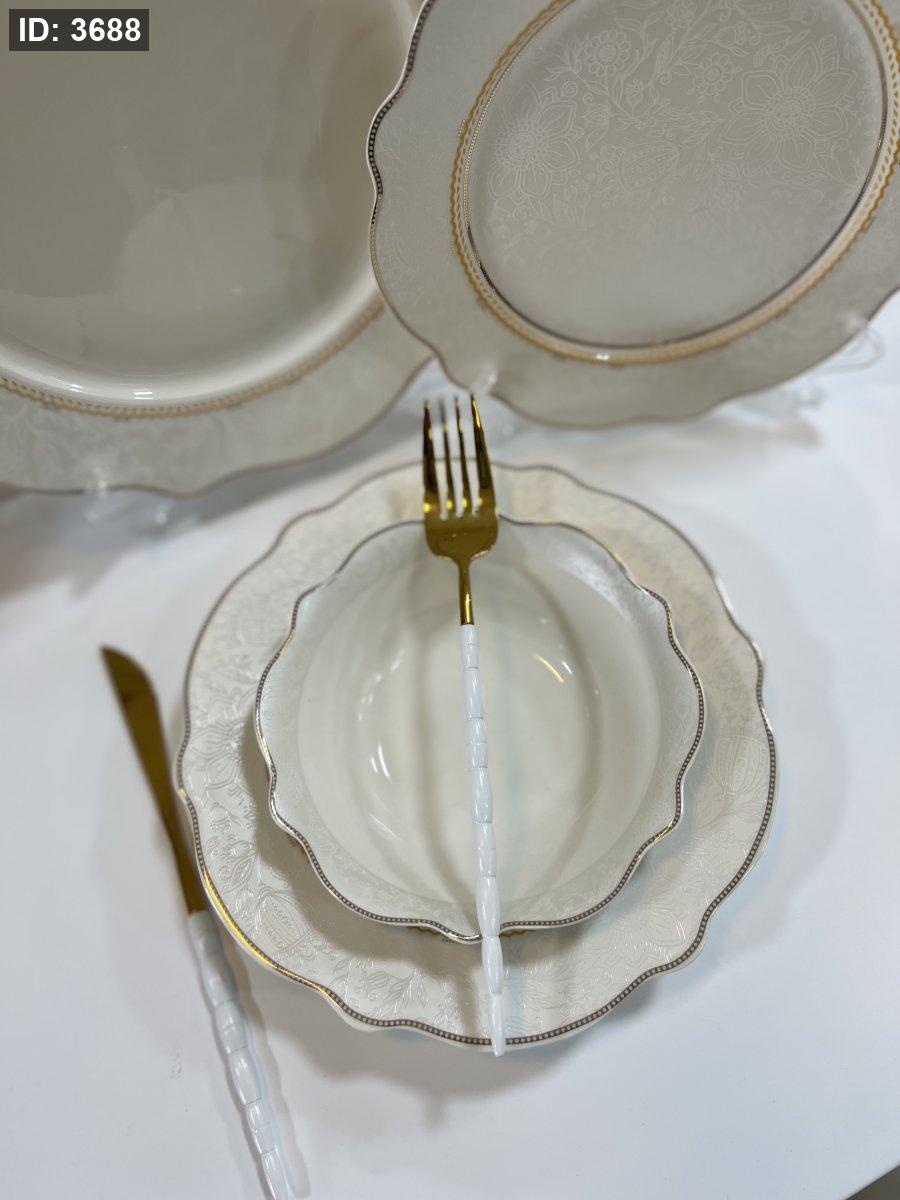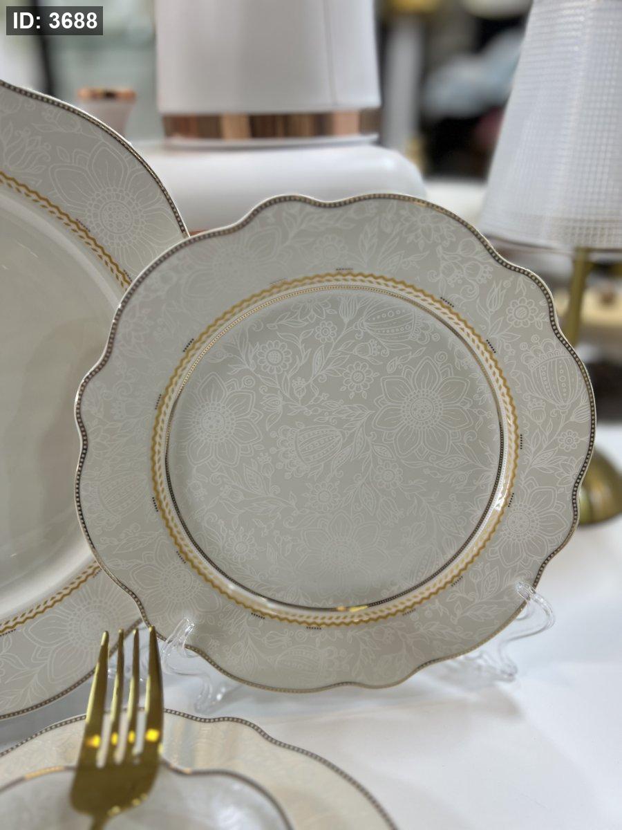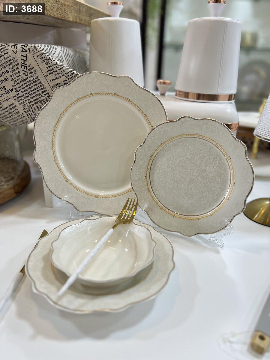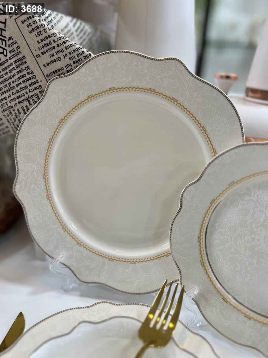 طقم صحون بورسلان فاخر – 24 قطعة | تصميم أنيق بلمسة ذهبية ناعمة