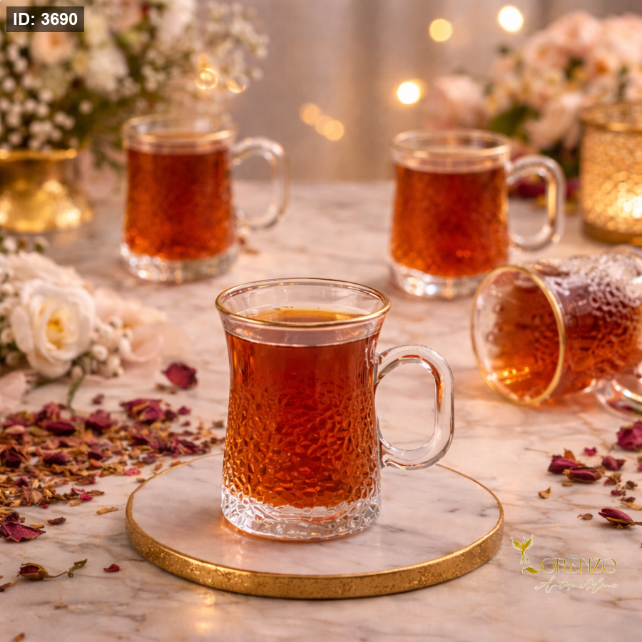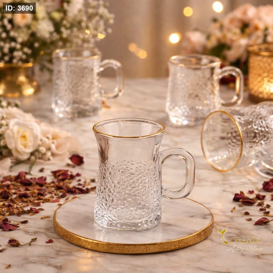 ارتقِ بتجربة تقديم الشاي مع هذا الطقم الراقي المكوّن من 12 كاسة زجاجية بتصميم عصري جذاب. يتميز بنقشة زجاجية أنيقة تعكس الضوء بشكل جميل، مع حافة ذهبية تضيف لمسة فخامة مميزة تجعل كل جلسة أكثر أناقة.