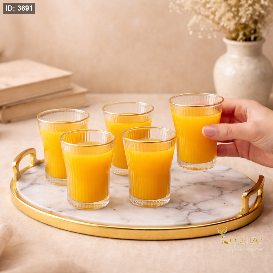 أضف لمسة من الأناقة والفخامة إلى مائدتك مع طقم الكاسات الزجاجية المخططة بتصميم عصري راقٍ. يتميز هذا الطقم بحافة ذهبية أنيقة تضفي لمسة فاخرة، مع زجاج شفاف عالي الجودة يُبرز جمال المشروبات سواء كانت شاي، عصير أو قهوة.