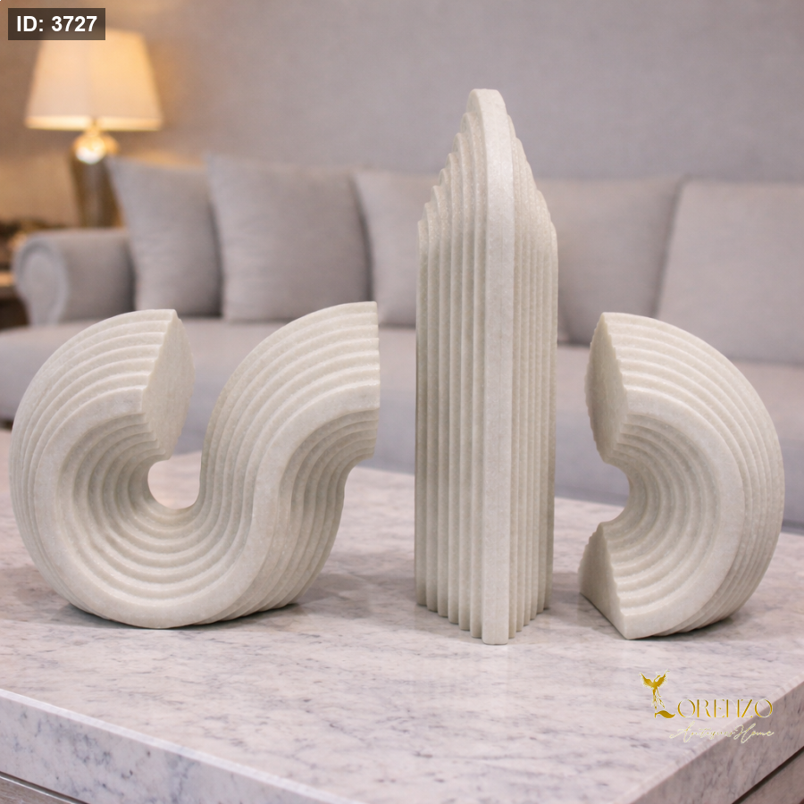 أضف لمسة فنية مميزة إلى ديكور منزلك مع هذا الطقم الراقي بتصميمه الهندسي المنحني والملفت. يتميز بأشكال متدرجة وانسيابية تعكس أسلوبًا عصريًا بسيطًا مع لمسة فخامة هادئة.