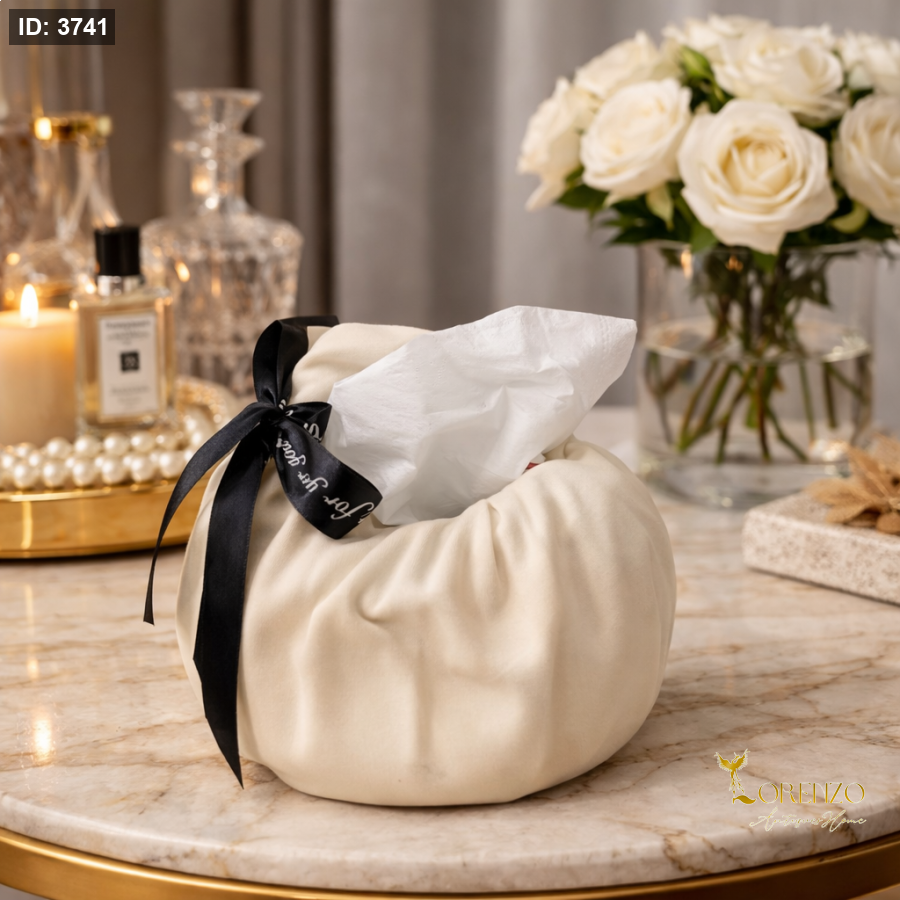 علبة مناديل بتصميم أنيق وناعم مستوحى من الطابع الفخم والبسيط، تأتي بشكل كيس أنثوي جذاب مع ربطة ساتان سوداء تضيف لمسة راقية ومميزة. تفاصيلها المنحنية تعكس إحساساً بالنعومة والدفء، لتكون قطعة ديكور مثالية في أي زاوية.