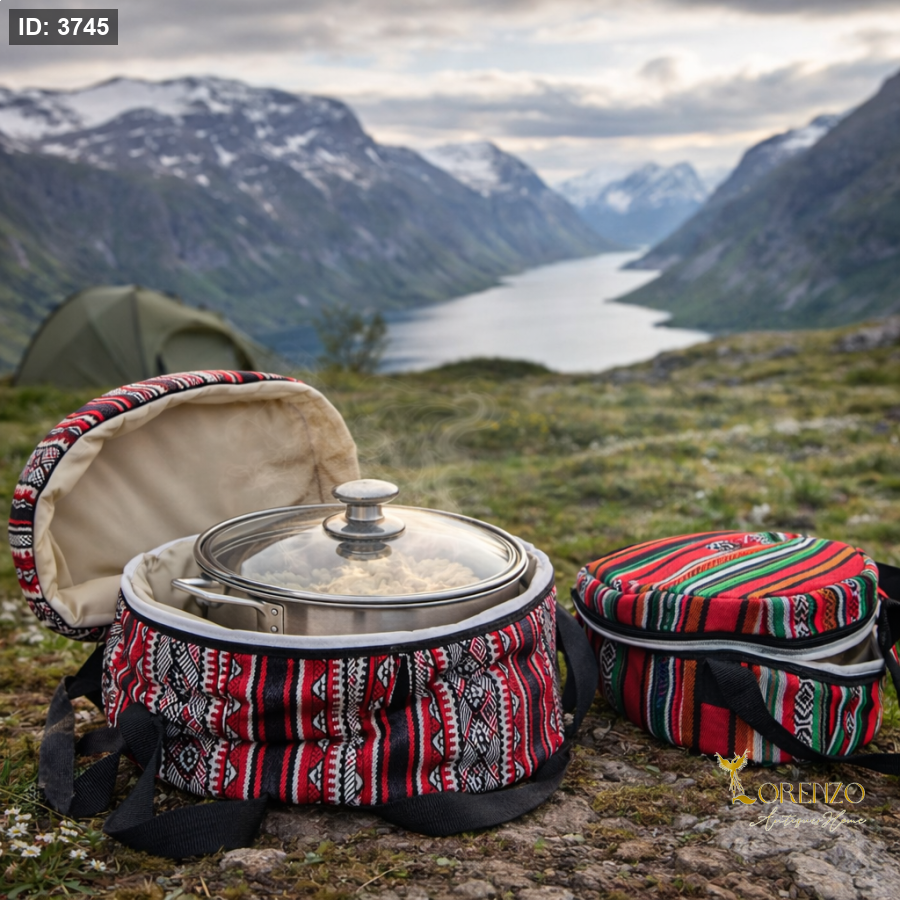 استمتع بنقل طعامك بأناقة وأمان مع حافظة الطعام القماشية ذات التصميم التراثي الجميل، المثالية للرحلات، التخييم، والعزائم الخارجية.