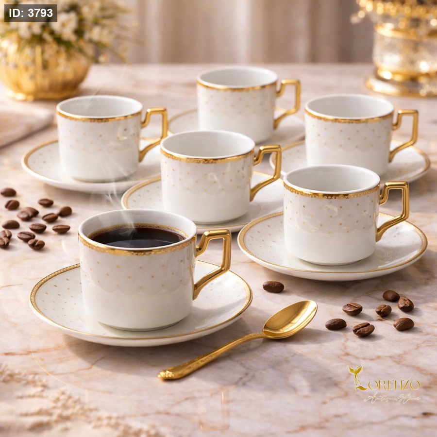 استمتع بأرقى تجربة تقديم القهوة مع هذا الطقم الفخم المصنوع من البون تشاينا عالي الجودة، بتصميم ناعم مزخرف بنقاط ذهبية وحواف لامعة تضيف لمسة أناقة استثنائية لكل ضيافة.