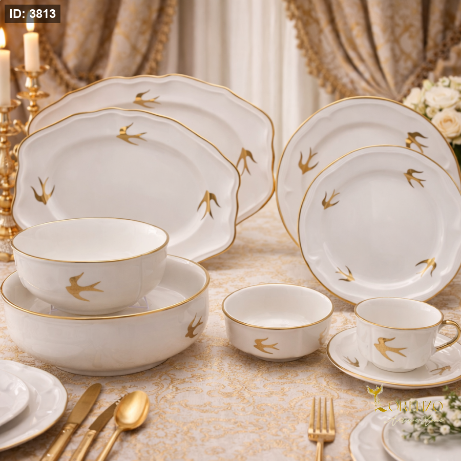 يتميز الطقم بنقشة طيور ذهبية ناعمة موزعة بشكل أنيق على القطع، مع حواف مذهبة تعزز الفخامة وتمنح كل قطعة لمسة مميزة. الشكل المموج للأطباق يضيف جمالية راقية ويجعل الطقم مختلفاً ولافتاً.