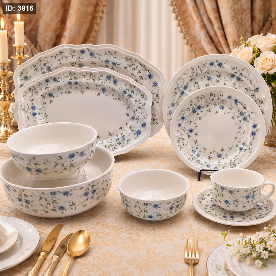 يتميز الطقم بزخارف زهرية رقيقة بدرجات الأزرق مع أغصان خضراء خفيفة، موزعة بشكل دائري أنيق على الأطباق، مما يعطي مظهراً متناغماً وجذاباً. الحواف المموجة تضيف لمسة كلاسيكية راقية تناسب مختلف أنماط السفرة.