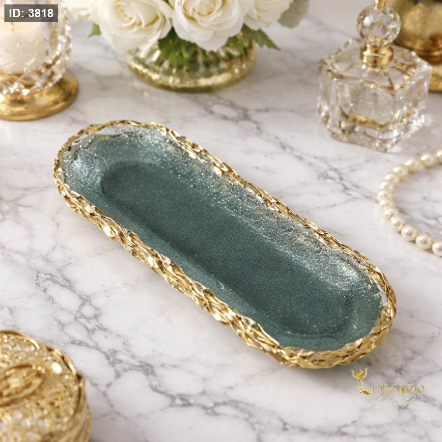 جاط صينية أنيقة بتصميم طويل وانسيابي تضيف لمسة فخامة لأي طاولة أو ديكور منزلي. تأتي بقاعدة زجاجية بلون أخضر داكن غني مع لمعة ناعمة تعكس الضوء بشكل جذاب، محاطة بإطار ذهبي مجدول يمنحها طابعًا راقيًا وفريدًا.