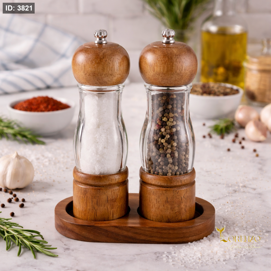 طقم متكامل يجمع بين الأناقة والعملية، يتكوّن من مطحنة ملح ومطحنة فلفل بتصميم عصري يجمع بين الزجاج الشفاف والخشب الطبيعي، مع قاعدة خشبية أنيقة وعلبة تغليف مميزة مثالية للتقديم كهدية.