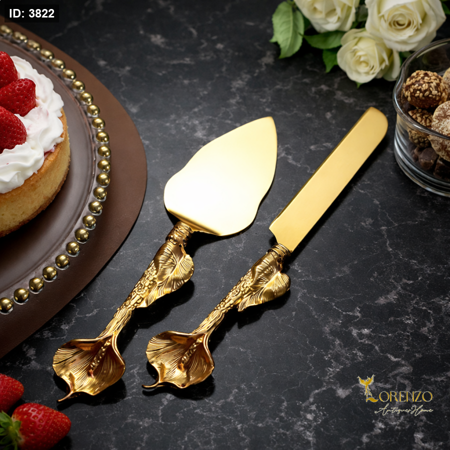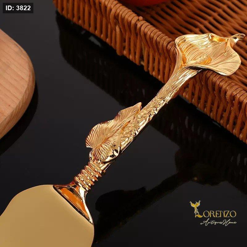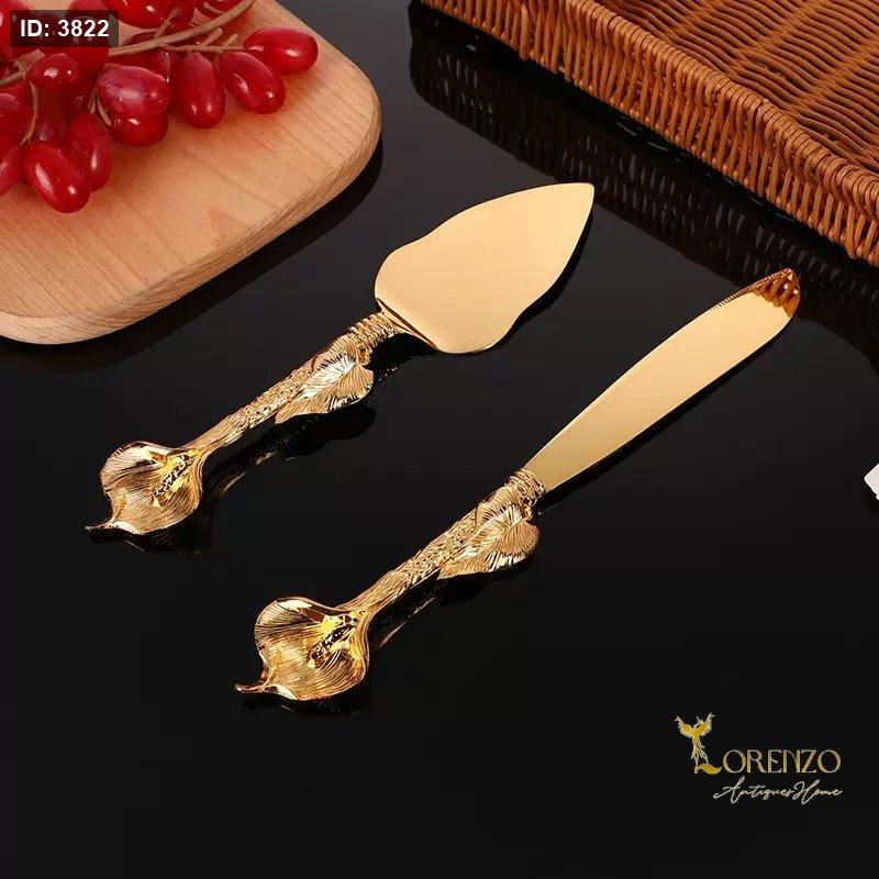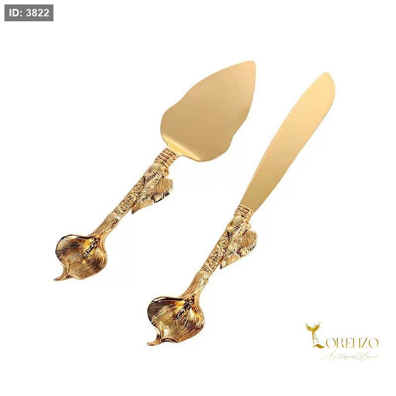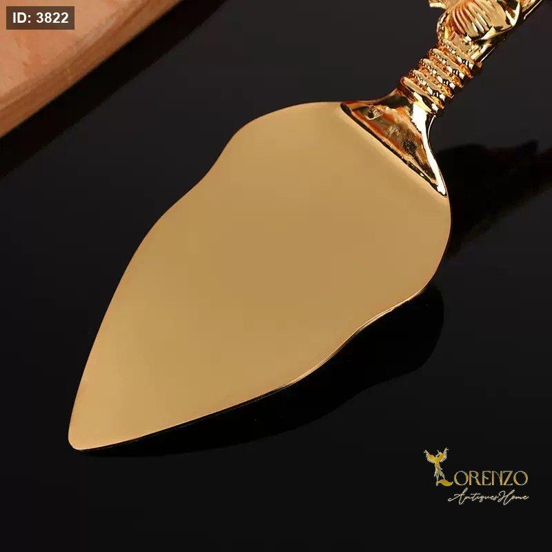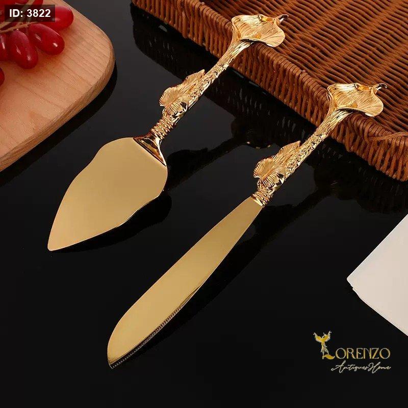 طقم أنيق وفاخر مخصص لتقديم الكيك والحلويات، يتميز بتصميم ذهبي لامع مع مقابض مزخرفة بنقوش راقية تضيف لمسة فنية مميزة لكل مناسبة.