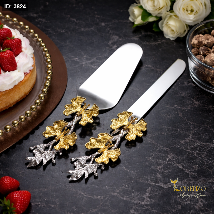 طقم تقديم كيك أنيق يجمع بين الفخامة والتفاصيل الفنية، يتميز بمقابض مزخرفة على شكل أوراق ذهبية مع لمسات فضية تعطيه مظهرًا راقيًا ومميزًا يناسب أجواء الضيافة الفخمة.