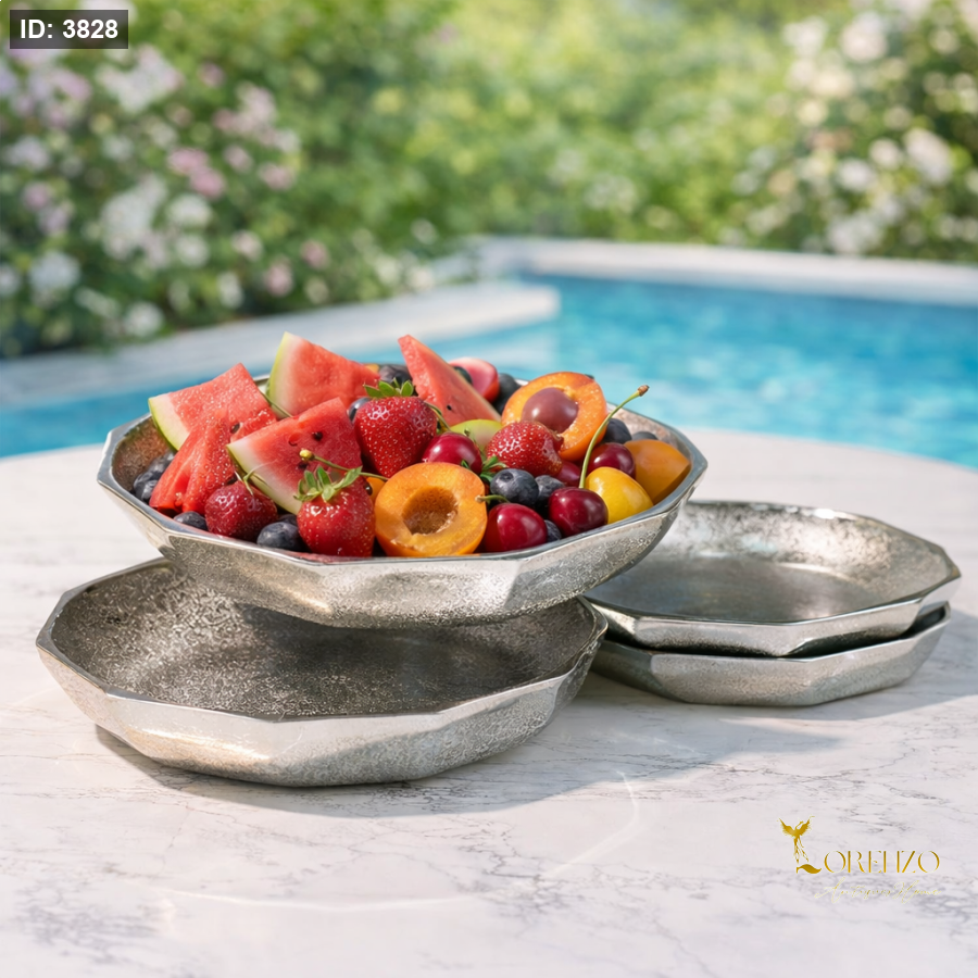 صحون تقديم أنيق باللون الفضي بلمسة فاخرة يضيف جمالاً راقياً لأي طاولة. يتميز بتصميم عصري بحواف ناعمة وتفاصيل ملمس مميز تعكس الإضاءة بشكل جذاب، مما يجعله قطعة مثالية للتقديم والديكور في نفس الوقت.
