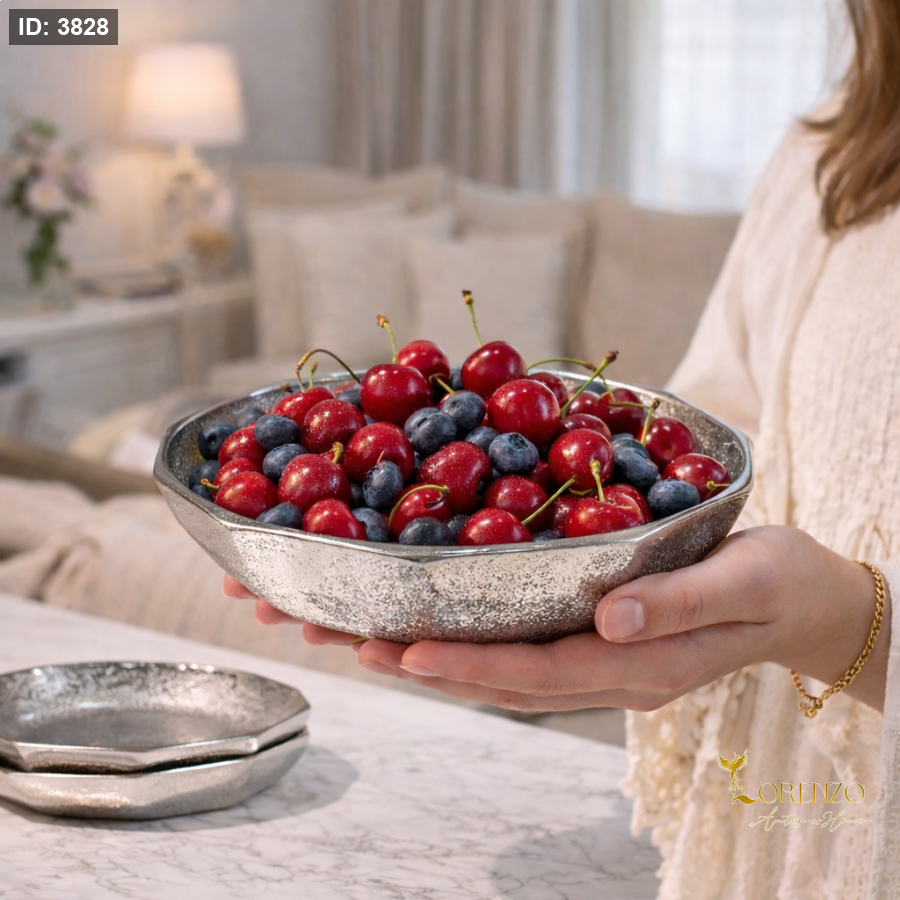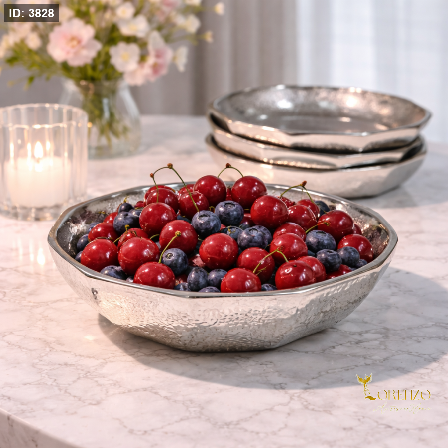 مصنوع من خامات عالية الجودة بلمعة فضية راقية، ما يمنحه مظهراً فخماً ومتانة للاستخدام اليومي أو في المناسبات. يمكن استخدامه لتقديم الفواكه الطازجة مثل الكرز والتوت، الحلويات، أو المقبلات بأسلوب أنيق وجذاب.