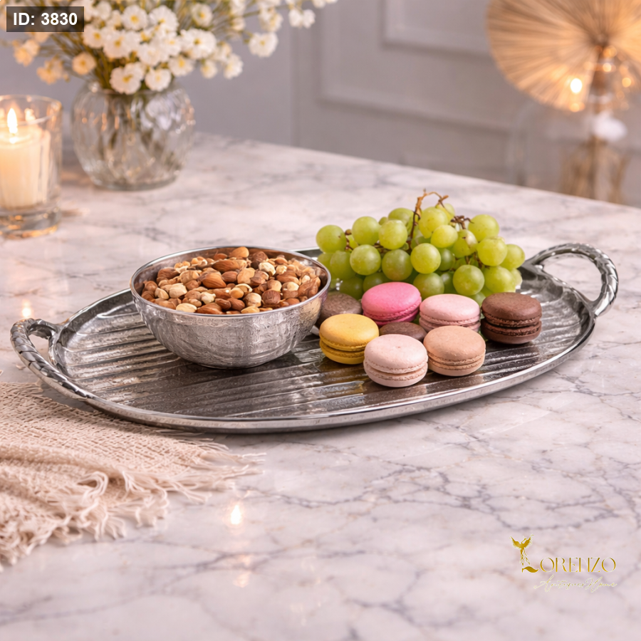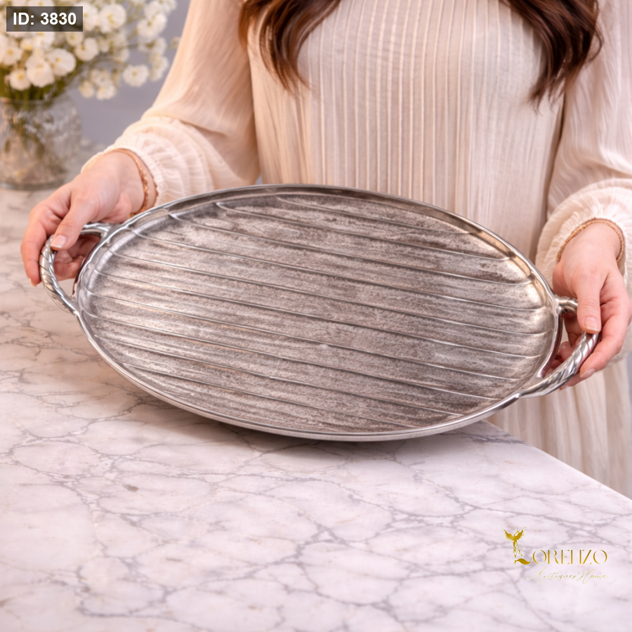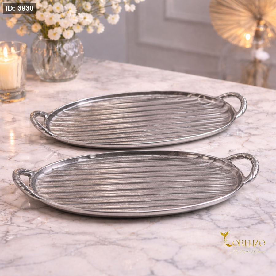 طقم صواني تقديم بيضاوية بتصميم فاخر ولمسة عصرية باللون الفضي، يجمع بين الأناقة والعملية ليكون إضافة مميزة لأي طاولة ضيافة. يتميز بنقشة سطحية بارزة تعكس الإضاءة بشكل جميل، مع مقابض جانبية بتصميم مميز تسهّل الحمل وتضيف لمسة فخامة واضحة.